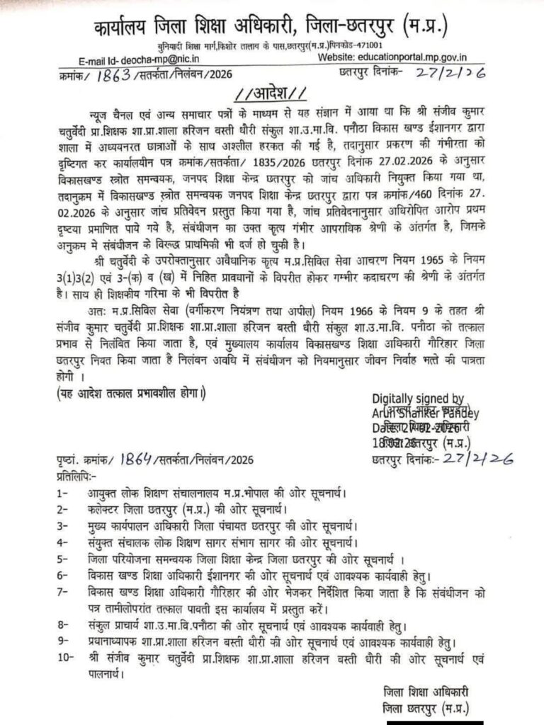 अनुचित व्यवहार के प्रयास में शामिल पाए जाने पर शिक्षक संजीव कुमार चतुर्वेदी को निलंबित कर दिया गया है, उनके विरुद्ध एफआईआर भी दर्ज की गई है।